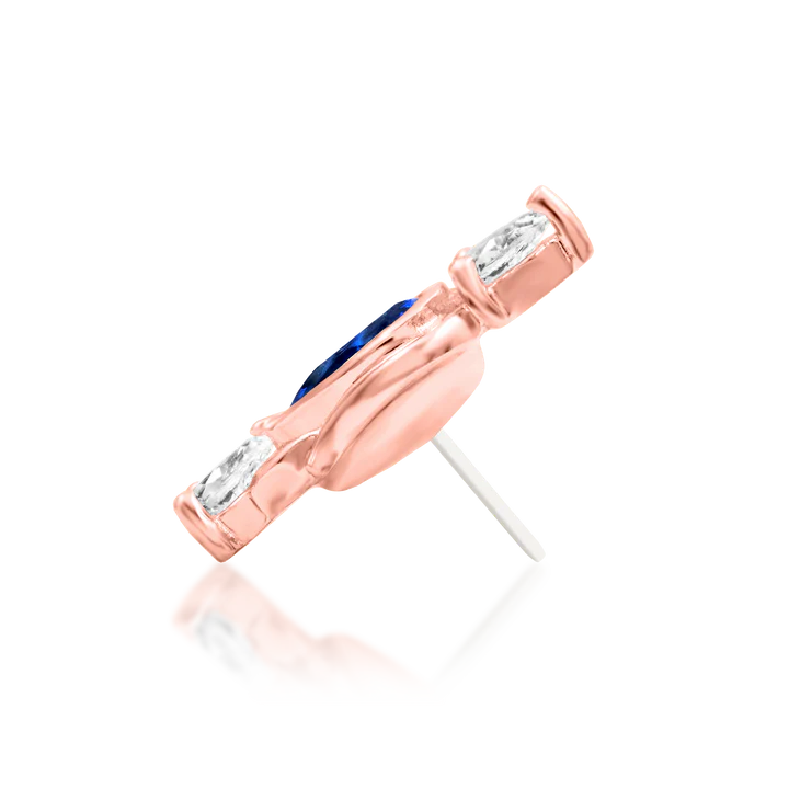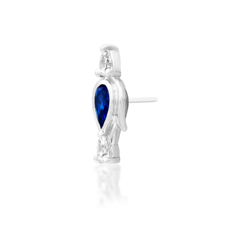 Augusta - A vibrant blue, reminiscent of a dewdrop, is cradled by two delicate petals, each adorned with a cubic zirconia.