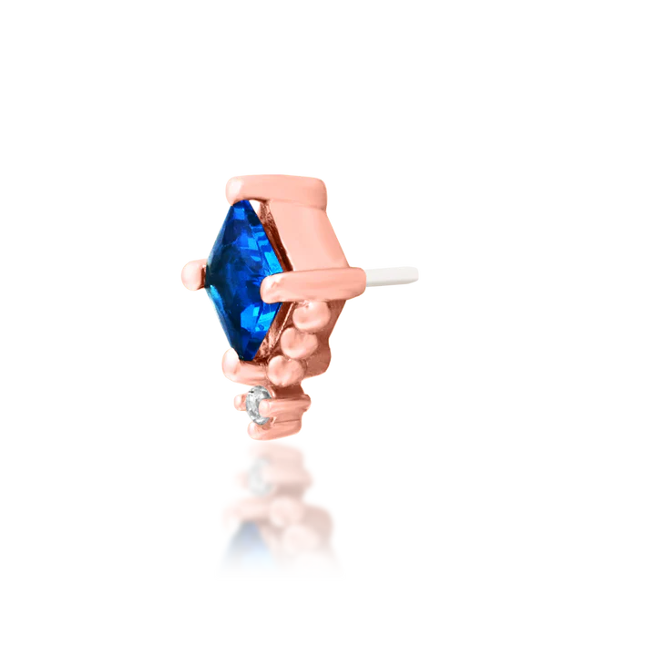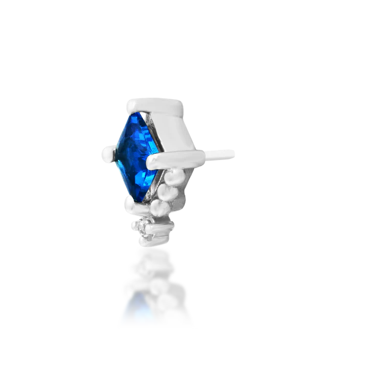 Like an evening star, this piece features a mesmerizing blue princess-cut gemstone, elegantly framed by intricate gold beading and sparkling cubic zirconia.