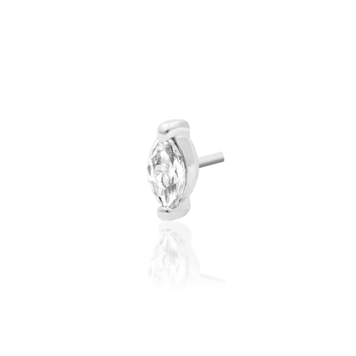 A star is born! Our first prong set single marquise stone (1.5mm x 3mm), mounted on a high polish 14k gold setting. Perfect for that touch of sparkle. Measuring 1.5mm x 4mm the marquis print is available in 14k Yellow, Rose and white gold