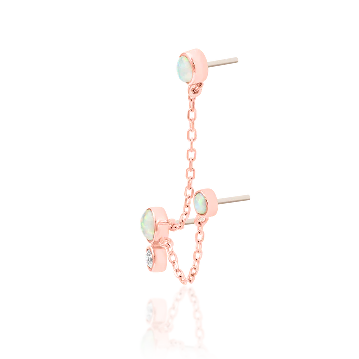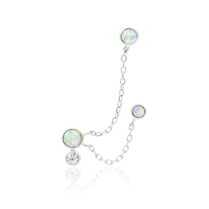 3 separate ends, a single 2mm CZ, and three Opals (3mm, 2.5mm and 2mm) and a pair of dangling delicate chains bring everything together. Mei measures 4mm x 29mm (chain 1 - 20mm and chain 2 - 14mm).