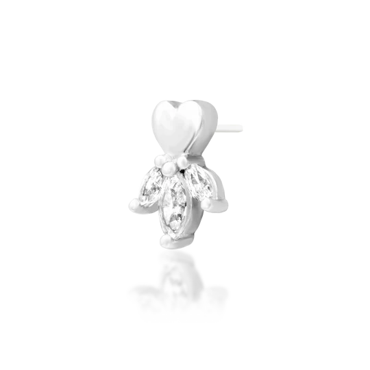 Where Love Takes Flight. A delicate heart-shaped charm, symbolizing love and renewal, is adorned with a cluster of sparkling marquise-cut.