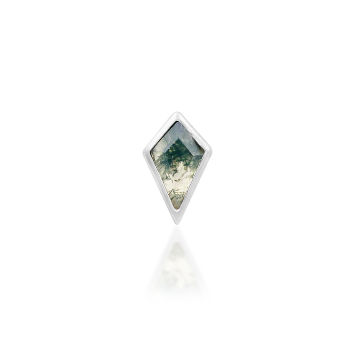 A 2.5x4mm diamond cute genuine moss agate stone wrapped up tight on a threadless 14kt bezel frame