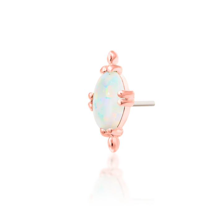 A stunning 3x5mm white faux opal oval cabochon paired with a flourish of gold beads